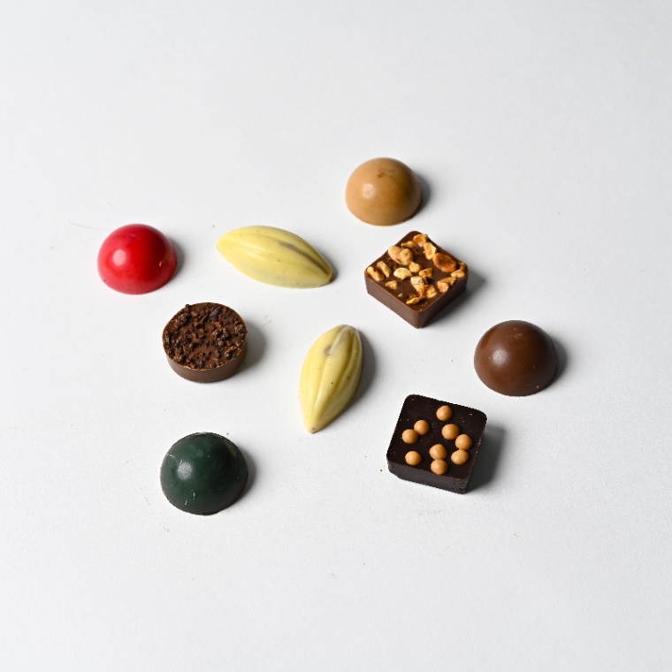 受賞歴のある塩バターキャラメルとヘーゼルナッツのスクエアプラリネをはじめ、新作のピスタチオプラリネ、バニラのプラリネなど、8種9粒のオリジナルプラリネアソート。